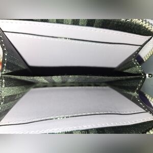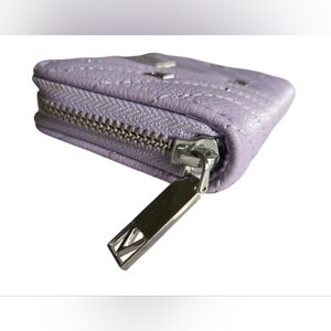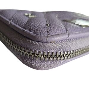 Elegant lavender wallet with quilted design. Features metallic accents and secure zipper closure.