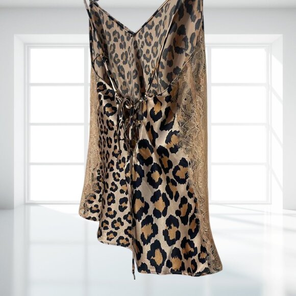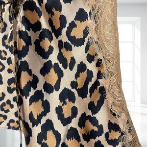 The set includes a camisole top and matching shorts, both in a classic animal print. The shorts are enhanced with delicate lace side panels for a feminine touch, and the fabric has a beautiful drape that feels like expensive satin or silk.