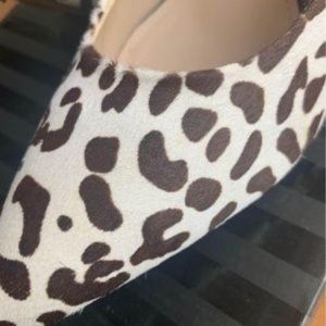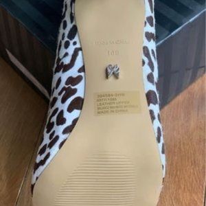 Never worn. Still in box. They have the look of real hair. They are a very sexy shoe I just haven't ever had the opportunity to wear them,besides I'm a little clumsy in stilettos, need wedges.