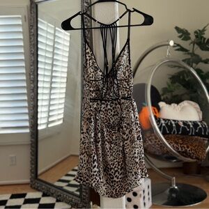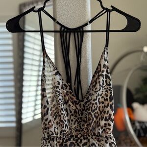 Stylish leopard print chemise. Features a flattering V-neck and adjustable straps. Perfect for a chic and comfortable look. Gorgeous backless fit