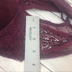 Deep burgundy, padded, lift, adjustable straps, wide lace band, plunge center, colors may vary due to lighting, good used condition, Sz: M