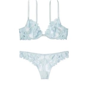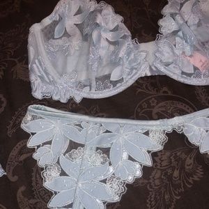 Elegant lace design. Delicate floral patterns. Includes bra, long-line bra, garter, brief, and thong.
