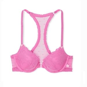 This is a brand new with tags matching bra & panty set by Victoria’s Secret. Both items are in the color "New Peony." The bra is a Sexy Tee Heart Bloom Lace Lightly Lined Front-Close Demi Bra, size 34D. The panties are a Tease Lace Cheeky Panty, size medium.