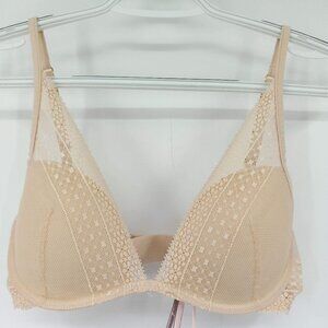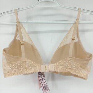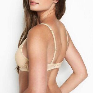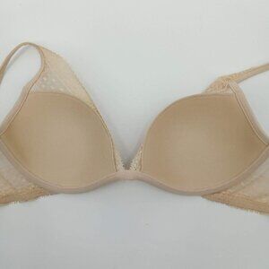 Victoria's Secret Lightly Lined Lace Plunge Bra In Champagne Beige Bralette Half Cup Comfort Soft Underwire Adjustable Straps Hook & Eye Closure.