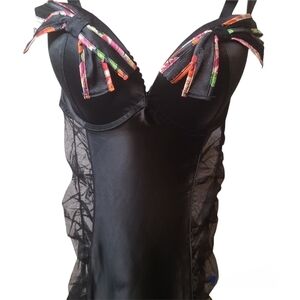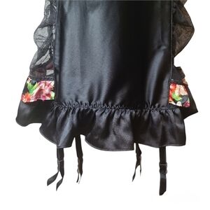 NWT Victoria's Secret Very Sexy Lingerie. Flattering Fit with Underwire Push-Up Cups in Bra, Double Hook and Eye Closure, Ruched Sheer Mesh Side Panels and Satin Mid-Panel. Bows on Cups and Back with Floral Detail Ruffles. Adjustable Shoulder Straps and Four Garter Clips. Black with Red, Pink, and Green Floral Details.