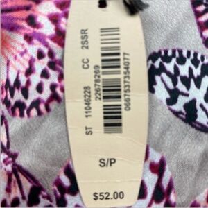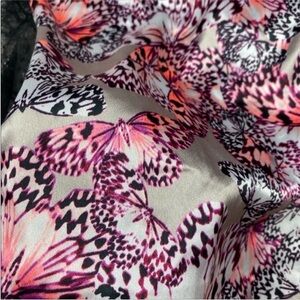 Charming dress with vibrant butterfly print. Features shades of purple, pink, and black.