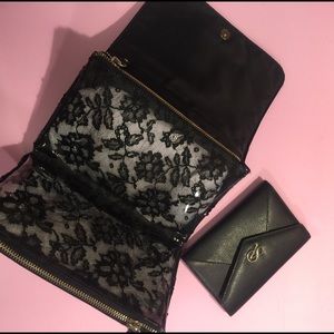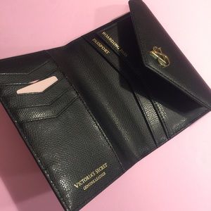 Victoria's Secret 3 piece travel set. Black suitcase, Sequin makeup case & leather wallet. New w/all tags attached. Suitcase-Black w/gold tones & leopard interior. Expandable handle & handle on top & side. Inside-2 zippered compartments & straps. Measures 21 inches high, 18 inches wide & 8-11 inches expanded. Wallet-Black Leather trifold w/several compartments for ID, cards, passport & boarding pass. Snap closure. Case-Black Sequin folding case w/ 2 zippered compartments. Snap closure.