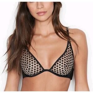 Victorias Secret Luxe Unlined Plunge Bra 32C Black Sheer Starburst Strappy Set S
