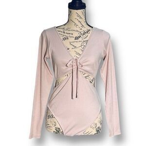 Victoria’s Secret M Mauve Ribbed Bodysuit Long Sleeve Tie Front Cutout Knit