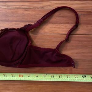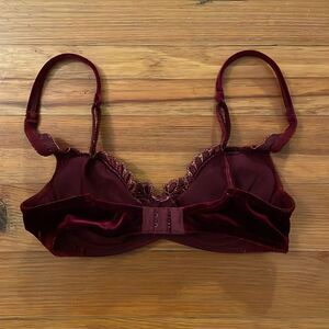 Maroon, wine red, velvet, bra with metallic gold embroidered by Victoria's Secret in a women's size 34B. Padded with silicone gel inserts. Adjustable bra straps. Velvet is 90% polyester and 10% spandex. Hand washable and has been cleaned. Approximate measurements shown in photos. In very good pre-owned condition. winter, holiday, soft, push-up, padded, dressy, sexy