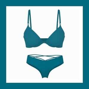 This is a matching bra and panty set by Victoria’s Secret. Both are from the Very Sexy line and in the color Jade.