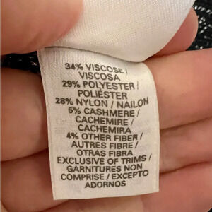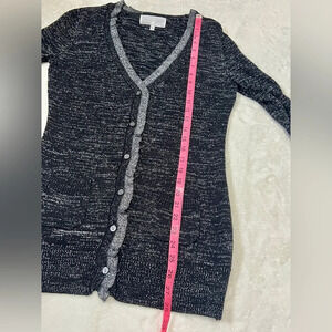 Adorable Victoria’s Secret cardigan sweater in black metallic with silver trim, cashmere blended fabrication, extra stretch, v-neckline, front button closure, front side pockets, ribbed hems, longer length (below hips). Perfect holiday sweater.