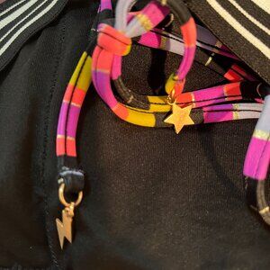 Features adjustable back tie that has a lightning bolt and star charm on it and removable pads