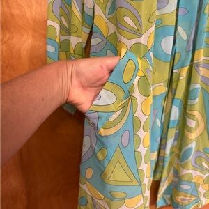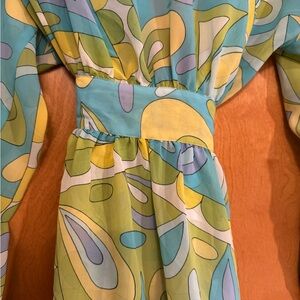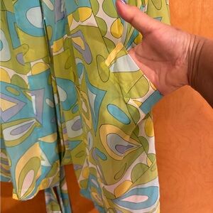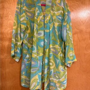 Chic and vibrant robe with a playful pattern. Sheer but not too sheer. Lightweight luxury. Perfect for stylish lounging. P2P 22” it says “one size” but I’d call it a M/L. Perfect condition. No snags, stains, or blemishes. And 2 pockets!