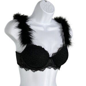 Victorias Secret New With Tags Demi Bra 32D Black Lace Faux Fur & Solid Straps Dream Angel Sexy Coquette Lightly Lined Velvet Polka Dots Flirty Vampy Bodycon