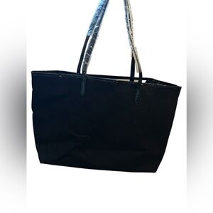 Victoria’s Secret black tote with silver shimmer throughout. Clear plastic V shape in the middle. Measurements: