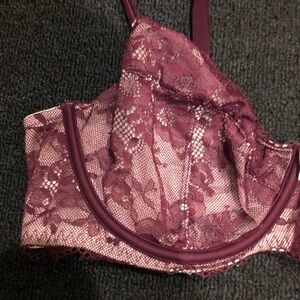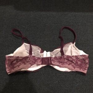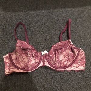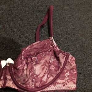 Victoria’s Secret No Padded Cream & Purple Floral Laced Bra. There is no padding, but there is wiring along the bottom. There is some slight wear along the bottom, the sign is some slight curling of the purple lace on the bottom. As shown in photos posted above. In otherwise great preowned condition. Feel free to make a reasonable offer through the offer button!