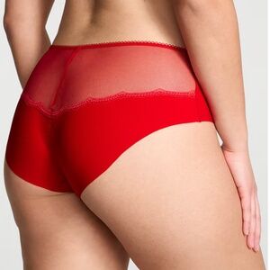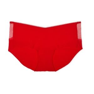 No-show lace-back hiphugger panty by Victoria's Secret. "Lipstick" red color. Sheer lace in back adds a femme touch to this second-skin pair, finished with raw-cut edges that are nearly invisible under the tightest clothes, even leggings. Low rise, now with a higher rise in back, full back coverage: shows curves, cotton gusset panel, breathable wicking material dries in a flash, and 4-way stretch moves with you. Brand new in packaging!