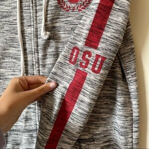 An Oklahoma State University sweater featuring a full zip up style, pockets, and a hood. Labeled a women’s size XS.