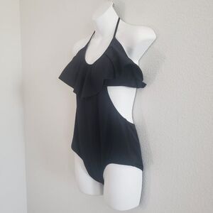 Victoria's Secret women's one piece swimsuit - ruffle trim, halter neckline, tie back, open back and side cutouts. Black.