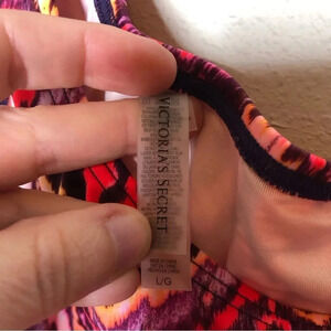 Super cute one piece swimsuit from Victoria's Secret in size large. One shoulder strap and lace up design on the opposite side. Shades of pink, purple and yellow. No cups or underwire. In excellent used condition.