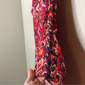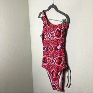 Super cute one piece swimsuit from Victoria's Secret in size large. One shoulder strap and lace up design on the opposite side. Shades of pink, purple and yellow. No cups or underwire. In excellent used condition.