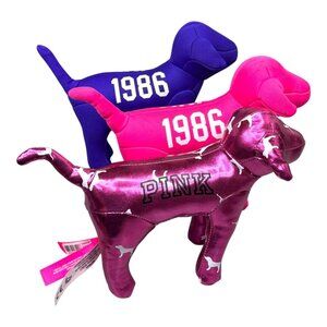 Add a touch of flair to your room with this vibrant set of three PINK 1986 plush toy dogs. These eye-catching collectibles are ideal for fans of the Victoria's Secret PINK line, offering an aesthetically pleasing and unique addition to your space. The set includes three distinctive colors: purple, pink, and metallic pink, each featuring the iconic 1986 branding.