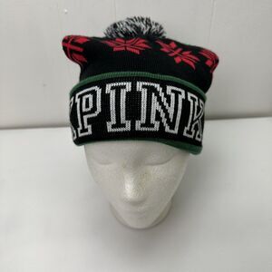 Victorias Secret PINK Beanie Hat Winter Cap Black Red Snowflakes Knit. It is pre owned in good used condition with some wear.