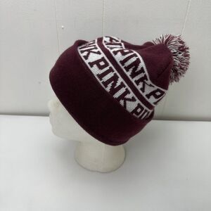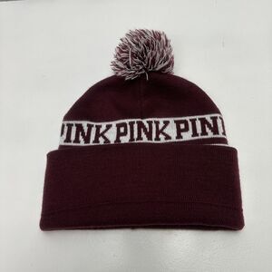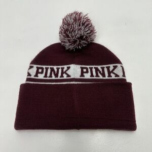 Victorias Secret PINK Beanie Hat Winter Cap Maroon White Knit. It is pre owned in good used condition with some wear.