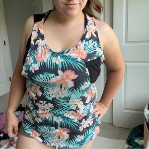 Details: This muscle tank is so cute! The classic dog logo is embroidered in black on the hip. Allover tropical palm & hibiscus flowers on the front. Pocket is solid black and the back is solid as well. Curved hem, raw edges on the sleeves. Crew neckline.