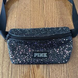 PINK by Victorias Secret glitter sequin belt bag fanny pack. Strap is completely adjustable. Has one large exterior zipper and the inside has a divider for 2 separate compartments. Black exterior with pink glitter/sequins (the glitter does not rub off). See pics for measurements. Large enough for keys, phones, cards, small wallet. In good condition. From a smoke free/pet free home