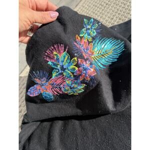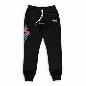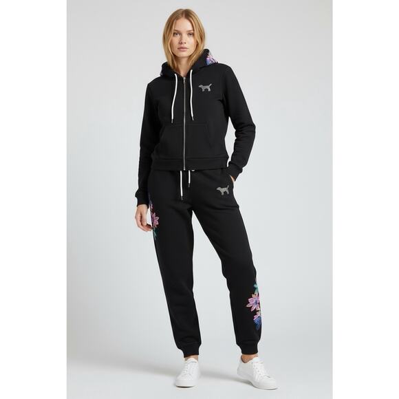 The Victoria's Secret PINK Bling Hibiscus Zip Up Hoodie/Sweatshirt Set in size small is a rare and stylish activewear set perfect for women looking to make a statement. Featuring a floral pattern with rhinestone and sequin accents, this black hoodie and sweatshirt set is a trendy addition to any wardrobe. Made from a comfortable cotton blend fleece material, this set is ideal for lounging or jogging with its long sleeves and full zip closure. The Victoria's Secret PINK branding and logo details add a touch of sparkle and love to this y2k-inspired set, making it a must-have for those who love to stand out.