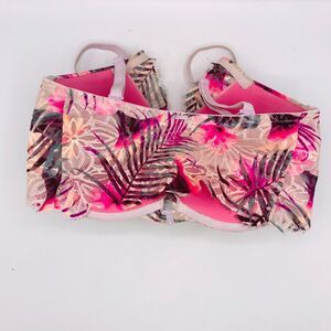 The Victoria's Secret PINK Date Super Push-up Padded Palm Front Close Bra in size 34DDD is a stylish and supportive underwired bra designed for women. The bra features a pink color with a floral palm pattern, padded cups for added comfort, and a front closure for easy wearing. Made from a blended fabric of polyamide and elastane, this push-up bra from the Victoria's Secret PINK product line offers a super push-up style to enhance the bust. Perfect for adding a touch of glamour to any lingerie collection, this bra combines fashion and function for a flattering look.