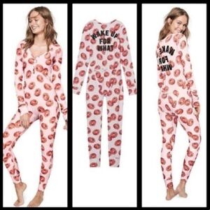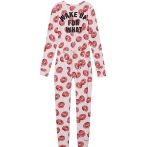 Victoria's Secret PINK Donut Onesie Pajamas Preowned excellent condition, no holes or stains, 60% cotton / 40% polyester. WAKE UP FOR WHAT" in black graphic print. Long Jane Onesie. Cozy thermal waffle weave fabric. Victorias Secret PINK. Pink with donuts all over. Snap flap at back, deep crew neckline, so comfortable and Cute, no trades