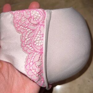 This bra is both sexy and comfy making it perfect for everyday wear! Loving the pink lace detail on top of the light pink solid color. The straps are comfy and elastic with the Victoria Secret brand detail on the straps.