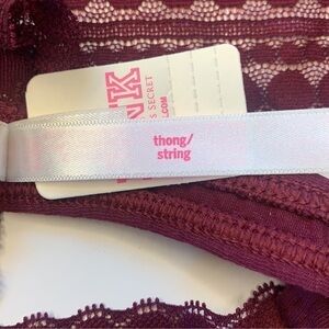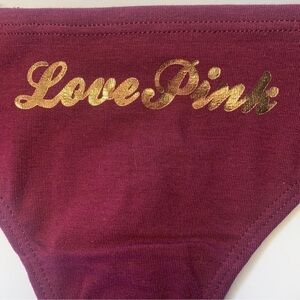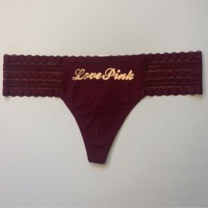 Burgundy thong with lace details and 'Love Pink' in gold foil