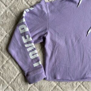 Details: Lavender long sleeve cold shoulder hoodie. Raw hem. “Love Pink” down right arm. Drawstring hood. Spell out sleeve. 60% cotton/40% polyester.