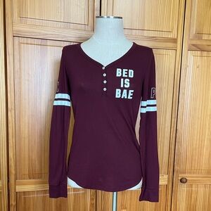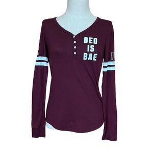 This Victoria’s Secret Pink burgundy long-sleeve Henley-style sleep shirt is perfect for lounging in comfort and style. Made from a soft cotton and polyester blend, it features a classic varsity-inspired design with white stripes on the sleeves and the playful phrase “Bed is Bae” on the left chest.