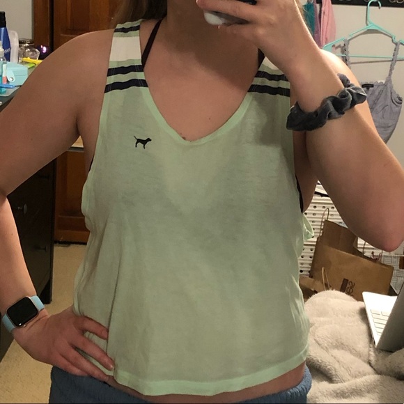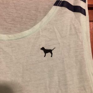 This is a tank top from Victoria’s Secret PINK in a size small. It is in the color mint green and has navy blue and white details on the straps. It is in great condition and works well as both a tank top and a swim suit cover up. Let me know if you have any questions and feel free to send me an offer 😊 bundle for a discount!