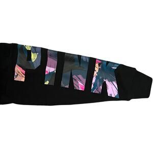 Description: Stylish and cozy, this Victoria’s Secret PINK quarter-zip pullover sweatshirt is perfect for casual wear. Made from soft fleece fabric, it features a high collar, kangaroo pocket, and bold PINK lettering on the sleeves with a vibrant multicolor graphic design. The black base color makes it versatile and easy to pair with leggings or jeans.