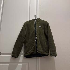 Victoria's Secret PINK Reversible Cozy Full Zip Sherpa Jacket Hoodie in Olive Green. This versatile jacket features soft sherpa on one side and a smooth finish on the other, making it a comfortable and stylish option for cooler weather. The full zip closure and hood provide extra warmth. Excellent pre-owned condition, with no visible stains or holes. Perfect for casual wear, athleisure, or layering.