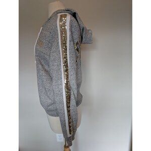 This hoodie combines comfort and style with its soft heather gray fabric and eye-catching sequins. Designed with gold sequin lettering and rose detailing, it provides a sophisticated yet casual look. The hoodie features a relaxed fit and adjustable drawstrings, making it both practical and fashionable.