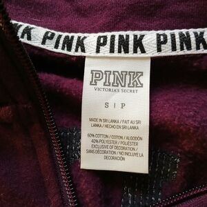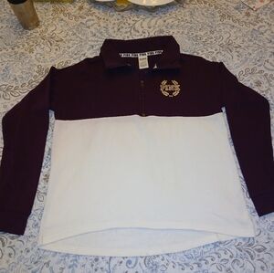 Stylish colorblock sweatshirt from Victoria's Secret PINK. Features a bold purple and white design with glittery gold lettering.