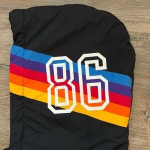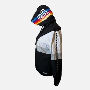 • Logo down sleeves, by hem, and rainbow on hood.