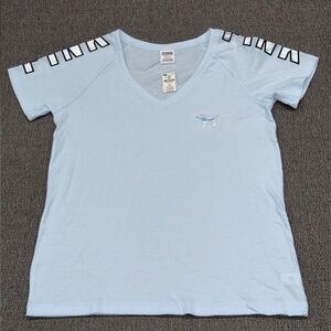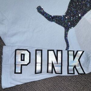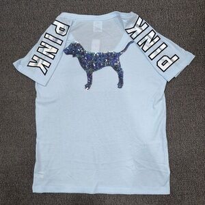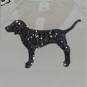 Blue shirt with iridescent letters on shoulders and sequin dog on back.