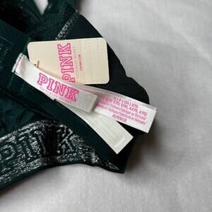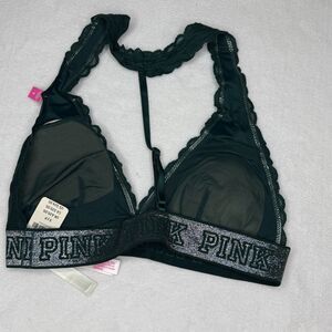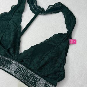 Victorias Secret PINK Small Lace Bralette Halter Bra Glitter Logo Dark Green NEW