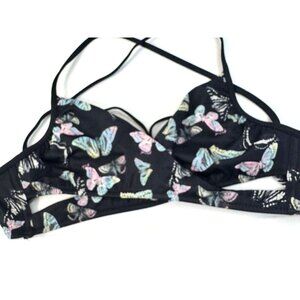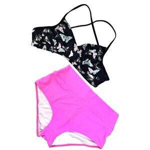 Make a bold splash in this Victoria’s Secret PINK two-piece swimsuit set featuring a vibrant neon pink cut-out bikini top (Size S) and black high-waist bikini bottoms with an adorable butterfly print (Size M).