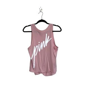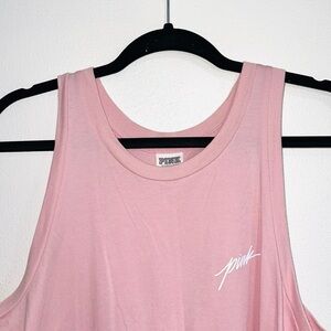 PINK Victoria’s Secret light pink icon muscle tank top. In excellent condition! Crew neckline. Sleeveless. Knotted front hem. Small PINK logo on the front. Larger icon on the backside. Blush pink color. Size small.