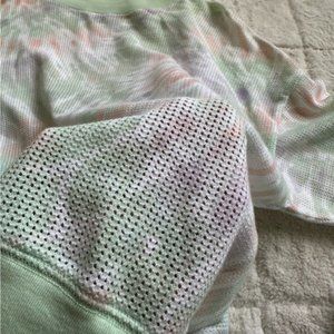 Details: Mint knit hem and sleeves. Crew neck with dropped sleeves. Allover pastel tie dye on mesh. Pattern on this is intentional.