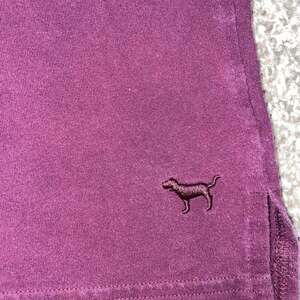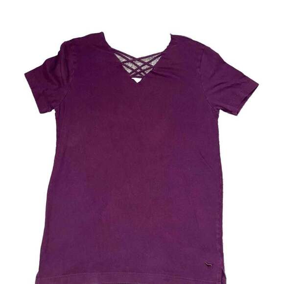Victoria's Secret PINK V-Neck Short Sleeve T-Shirt in a rich burgundy color, women's size XS. This tee features a stylish V-neck with criss-cross detailing on the back, adding a unique touch to a classic silhouette. Made for comfort, it's perfect for casual wear, lounging, or pairing with your favorite jeans. The iconic PINK dog logo is subtly embroidered on the hem. Excellent pre-owned condition, with no visible flaws.